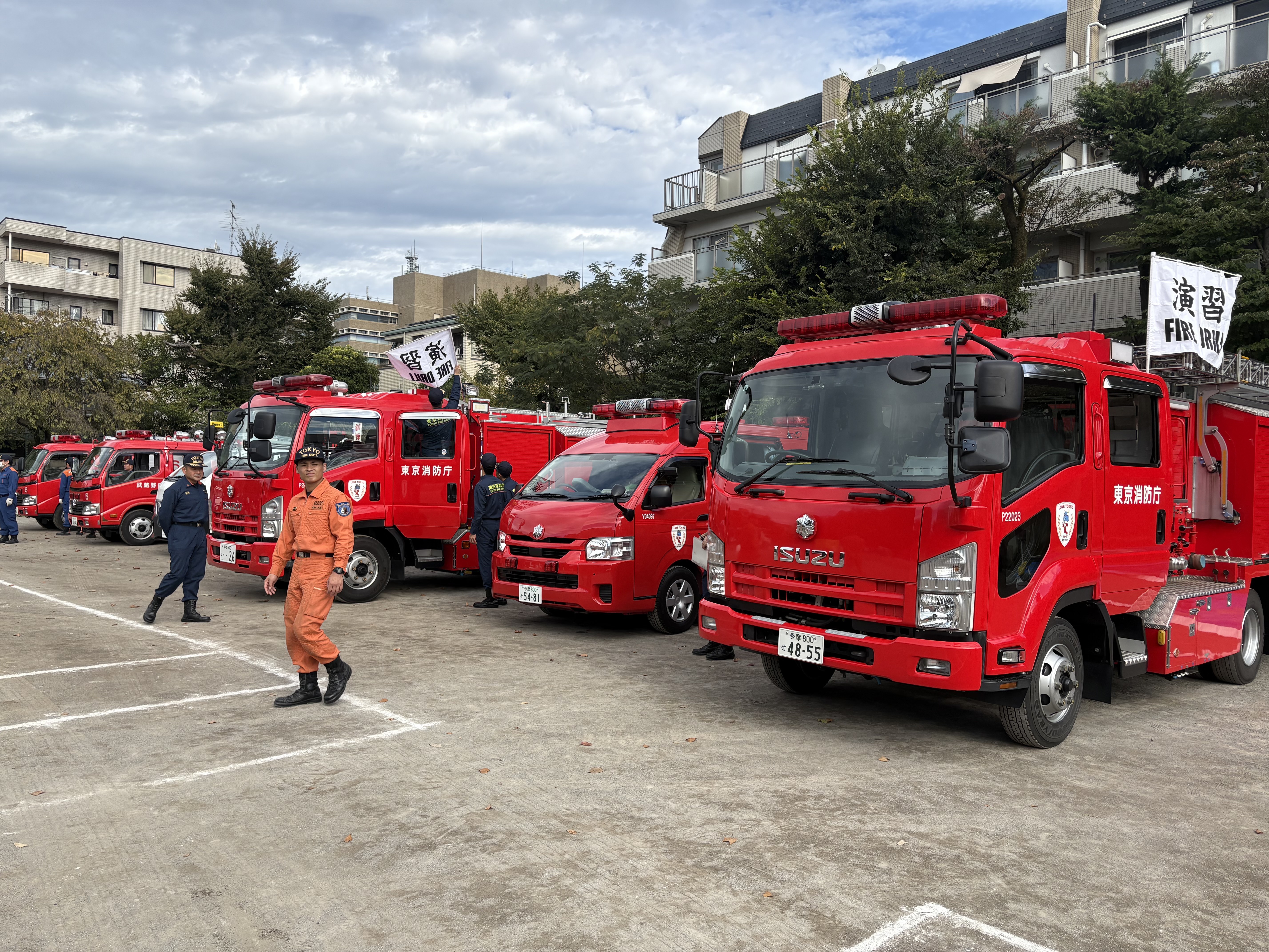 更に、武蔵野消防からは実際に多くの消防車が参集され、消火訓練や煙の中の移動体験など、より広い意味での防災訓練となりました
